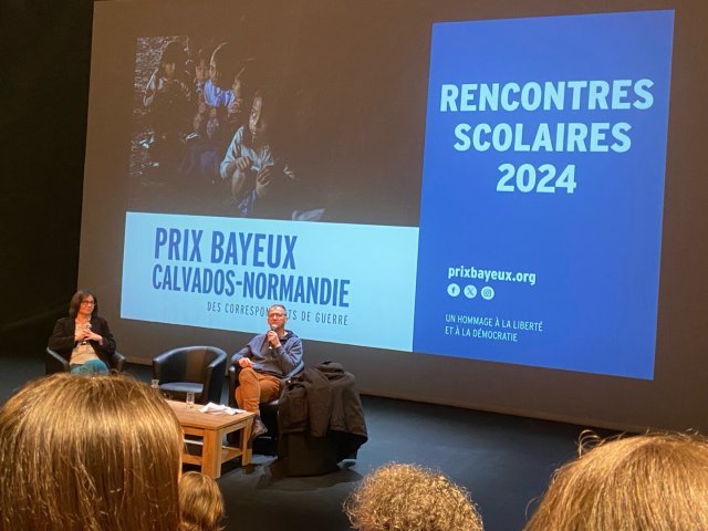 Pour ce premier jour du Prix Bayeux Calvados-Normandie des correspondants de guerre, la classe de 1G7 ont visionné avec d’autres lycées les reportages de la sélection officielle-catégorie télévision à Mont Saint Aignan.
